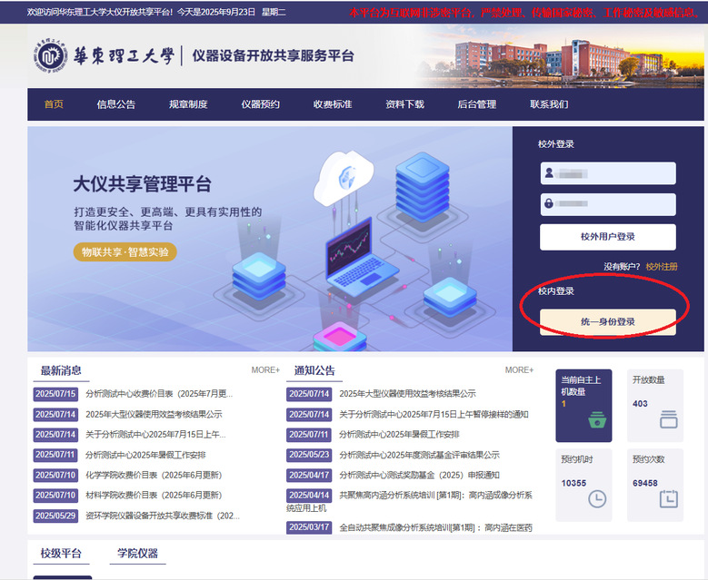 1. 登录官网:浏览器输入华东理工大学大仪开放共享平台官网地址(https://yqgx.ecust.edu.cn/webindex/index.do),进入官网首页。在首页右上角,点击 “统一身份登录” 按钮即可进入登录环节。点击 “统一身份登录” 后,会跳转到学校统一身份认证登录页面。在页面中输入你的用户名和密码,完成登录即可。