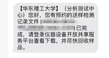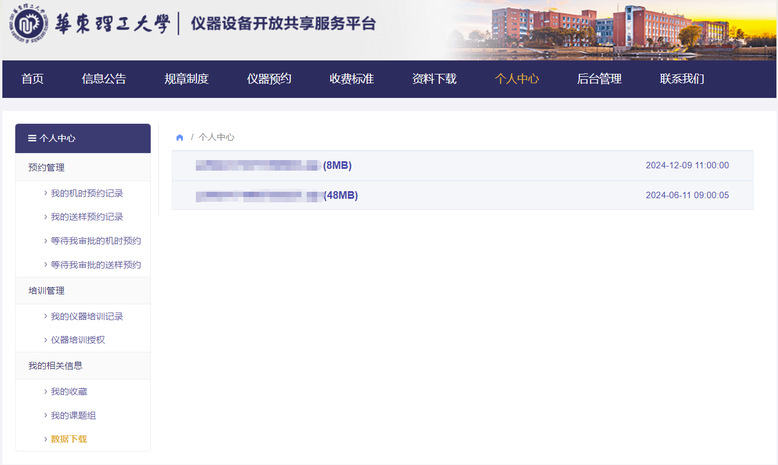 样品测试完成后,送样用户会收到【华东理工大学】发送的短信通知,告知检测记录文件已完成。此时,登录大仪开放共享服务平台,进入 “个人中心”,在左侧栏选择 “数据下载”,就能看到并下载你的检测数据啦。记得及时回收样品哦!