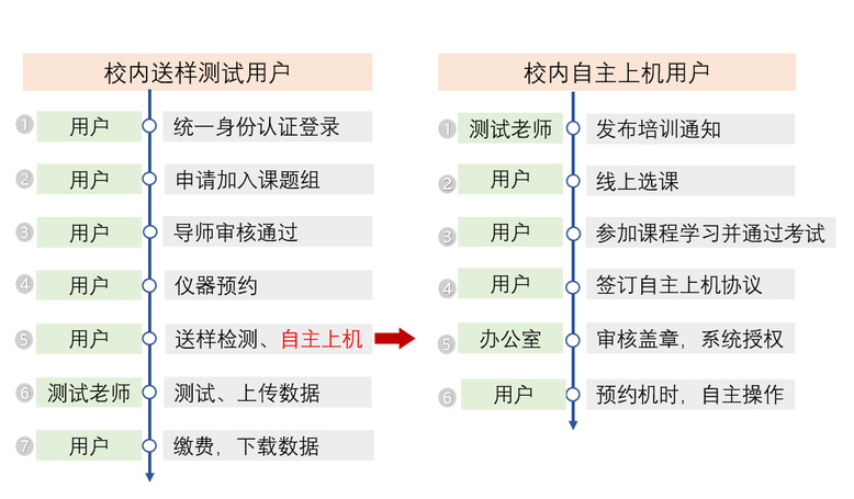 机时预约:需先获得自主上机资格后选择预约机时,提交预约申请,待审核通过后,即可在预约时间到实验室自主操作仪器。