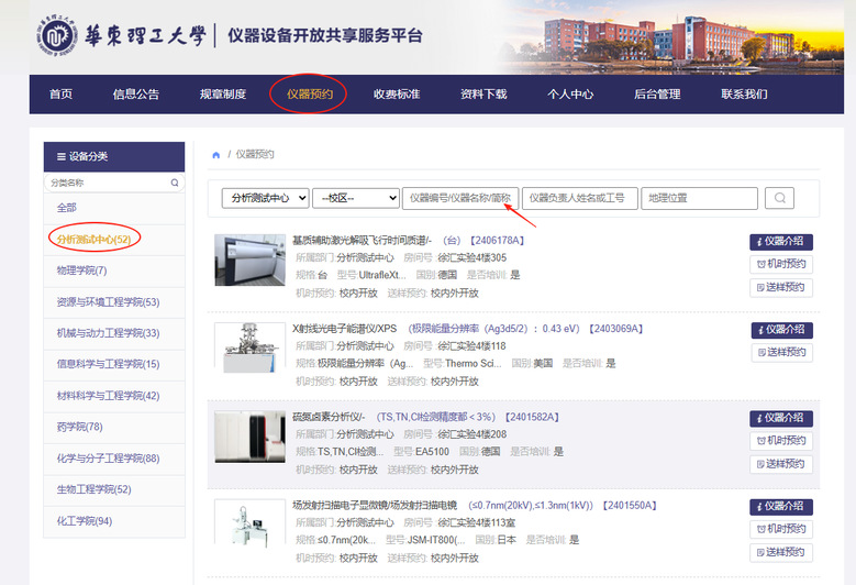 3. 仪器预约:点击仪器预约栏,在左侧的设备分类栏可以选择分析测试中心选择需要预约的仪器,也可在搜索栏搜索仪器编号或者仪器名称关键字。