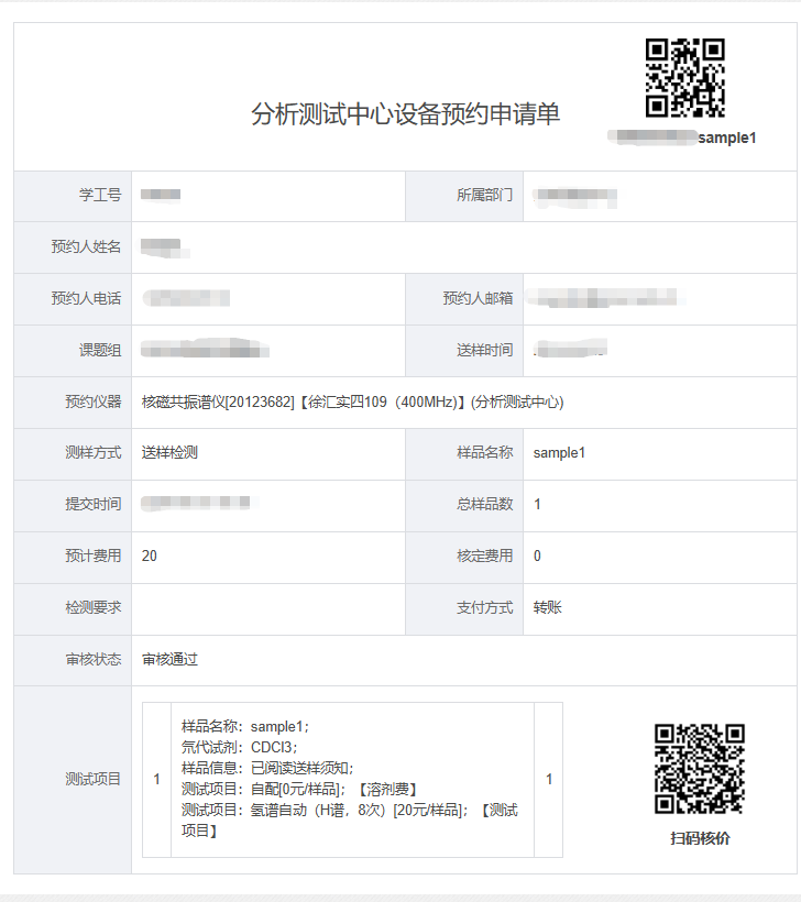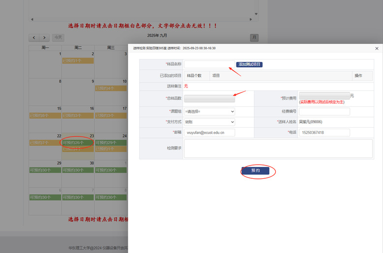 送样预约:无需自主上机资格,选择合适的送样时间,进入送样单填写界面,按提示填写样品名称、个数、检测要求、课题组、经费编号、支付方式等信息,提交即可。
