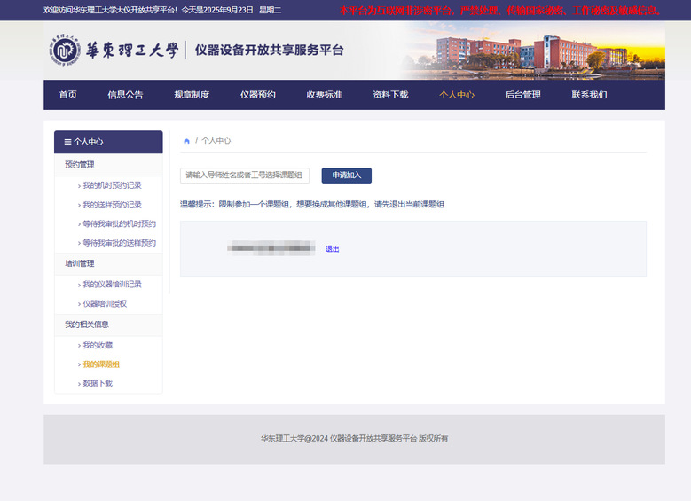 登录成功后,进入 “个人中心”,在页面中找到 “申请加入课题组” 板块,输入导师姓名或工号,选择对应的课题组提交申请。待课题组导师登录系统审核通过后,你就具备了预约设备的资格啦。